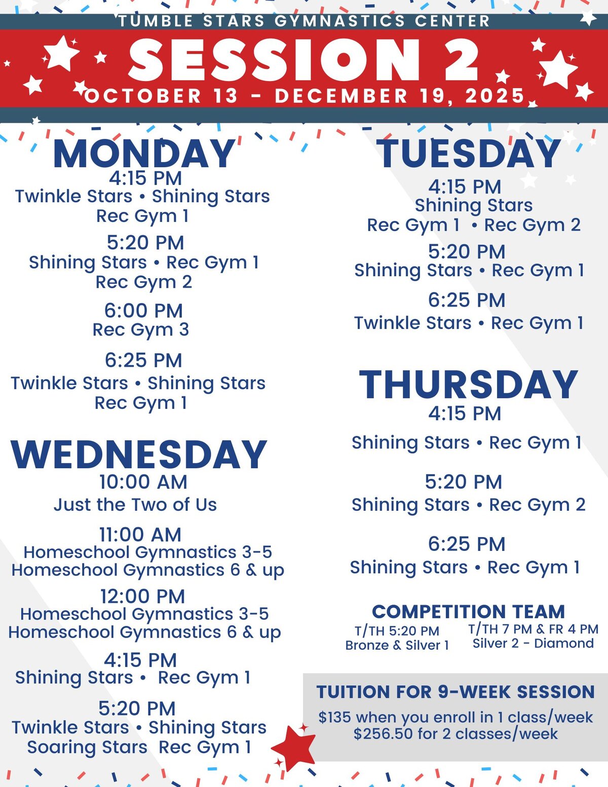 If Tumble Stars Gymnastics cancels classes for any reason, we will provide information about a make-up option.